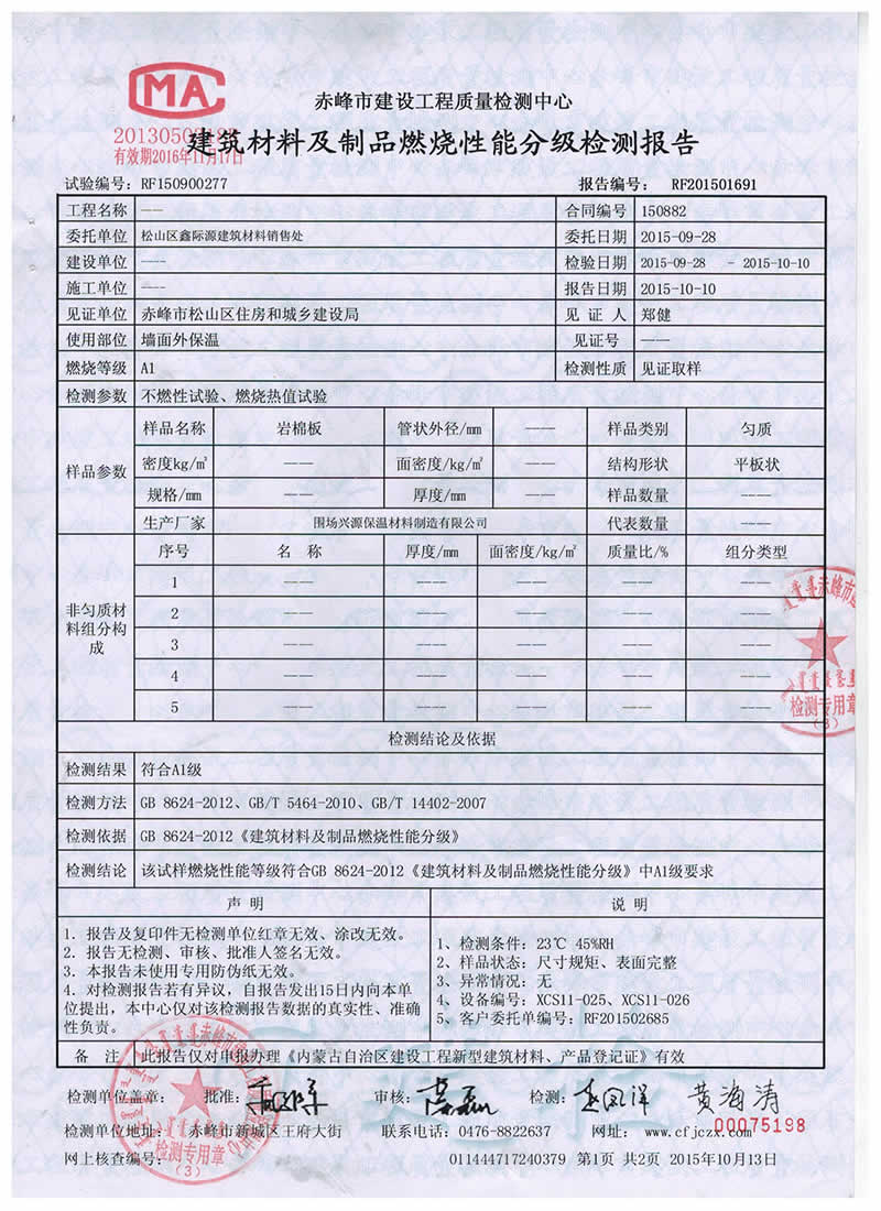 >>>2015-10-15 建筑材料及制品燃燒性能分級檢測報(bào)告